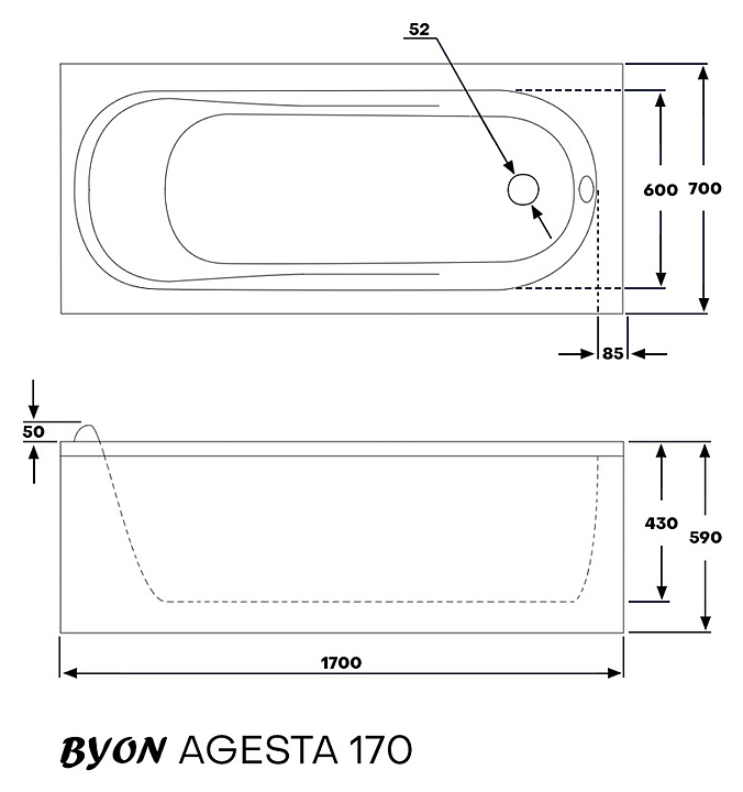 Ванна BYON AGESTA 170х70 см, с каркасом и лицевой панелью, акрил