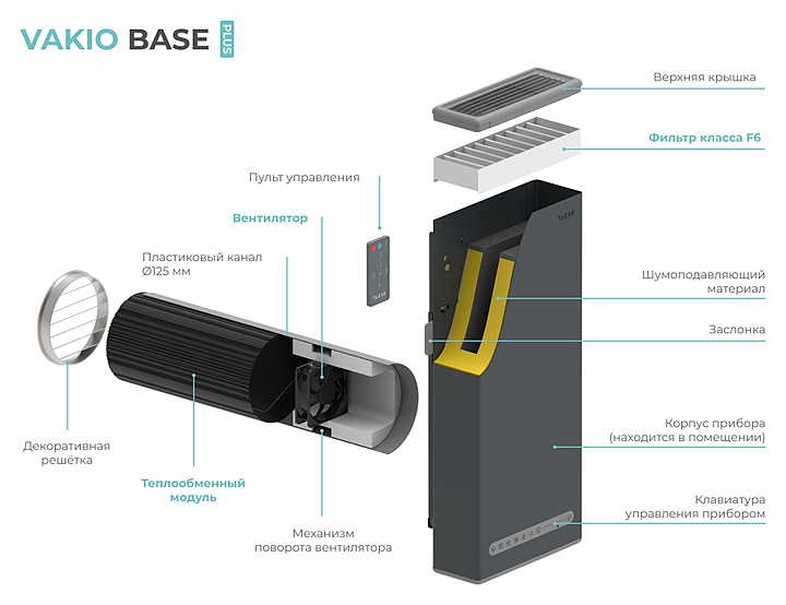Рекуператор воздуха Vakio Base Smart используется в гостиницах, отелях, офисных и жилых помещениях для вентиляции, фильтрации, нагрева и охлаждения воздуха. Модель оснащена теплообменником, работающим по принципу рекуперации: поступающий из помещения "плохой, отработанный" воздух удаляется на улицу, но оставляет все свое тепло в теплообменнике, далее это тепло используется для нагрева нового воздуха с улицы.