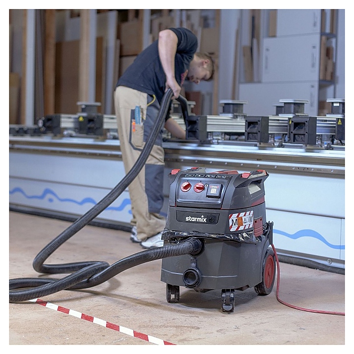Промышленный пылесос Starmix iPulse H 1635 Safe Plus предназначен для сбора опасной токсичной пыли категорий M и H, грязной жидкости, сухой очистки напольных поверхностей и стен в складских помещениях и производственных цехах на промышленных предприятиях различных отраслей, в автосервисах, в ходе ремонтно-строительных или реставрационных работ. Модель оснащена розеткой для подключения электроинструментов, поплавковым датчиком уровня жидкости, держателем для принадлежностей и интегрированным в ручку откидным крюком для хранения кабеля. Корпус и колеса выполнены из ударопрочного пластика, ведущая дуга – из металла, соединительная муфта – из резины, изоляция кабеля – из поливинилхлорида, складчатый кассетный HEPA-фильтр – из слоев стекловолокна, целлюлозы и полиэфирного материала. Комплектация:
