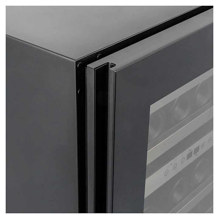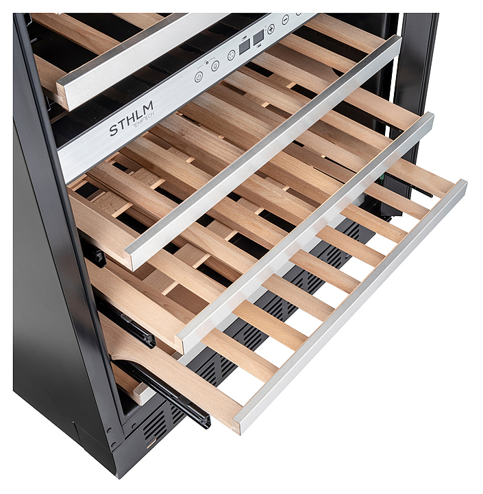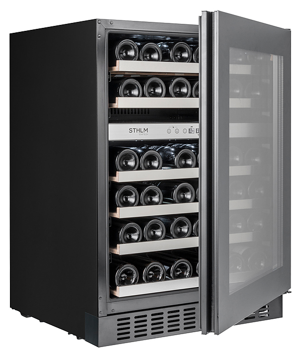 Винный шкаф Temptech STHLM STX60DRB предназначен для охлаждения, хранения и демонстрации бутилированного вина в отелях, винных магазинах, на предприятиях общественного питания и торговли. Модель оснащена сенсорной панелью с дисплеем для регулировки температуры и освещения, 6 выдвижными полками, дверцей со встроенной ручкой, фильтром с активированным углем и белой светодиодной подсветкой. Дверца выполнена из трехслойного стекла с защитой от УФ-лучей, передняя панель - из черного стекла, полки - из необработанного бука с деталями из нержавеющей стали. Особенности: