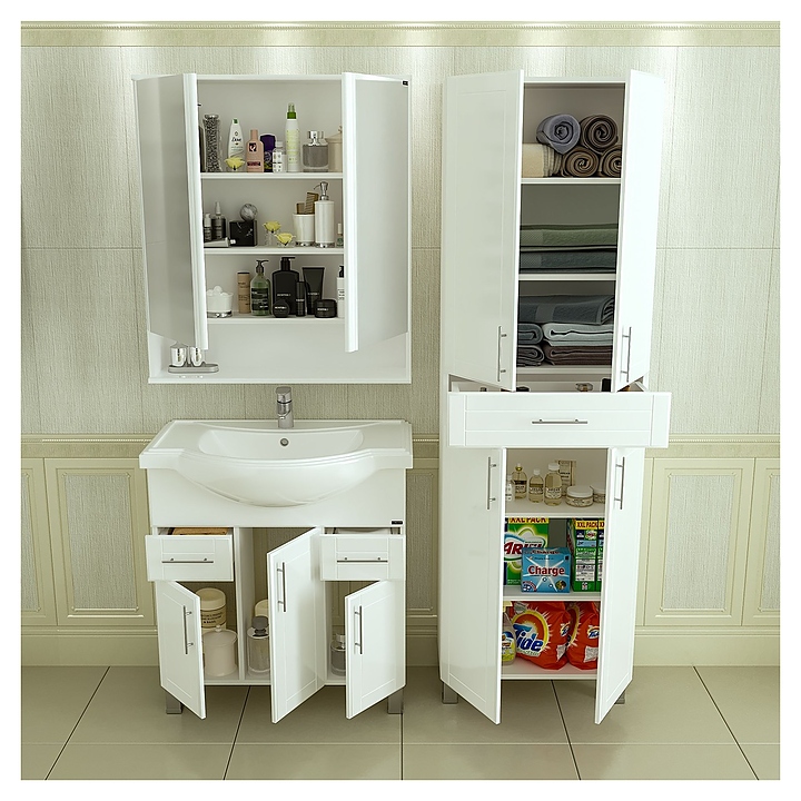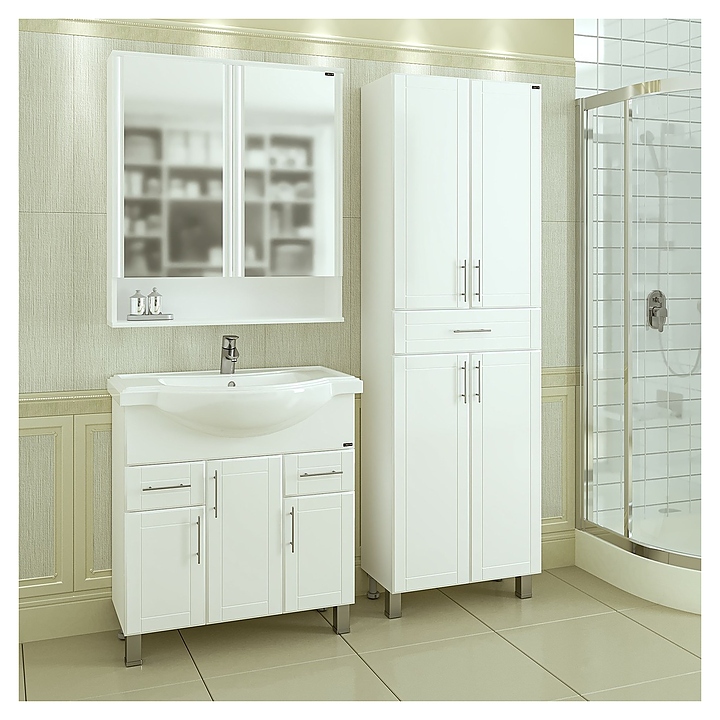 Тумба под раковину СаНта Дублин 80 дополнит интерьер ванной комнаты. Модель оснащена 3 распашными дверцами, 2 выдвижными ящиками и ножками, защищающими конструкцию от воздействия влаги в случае намокания пола. Корпус выполнен из влагостойкой ЛДСП, фасад - из МДФ и покрыт пленкой для защиты поверхности от внешних воздействий. Тумба используется вместе с раковиной Classic 80. В комплект поставки входят 5 ручек, 2 хромированные и 2 пластиковые ножки.