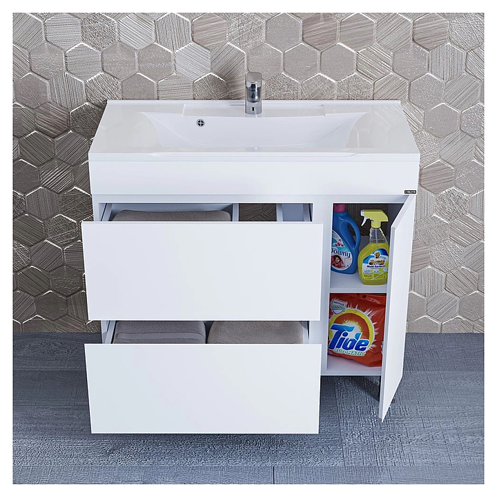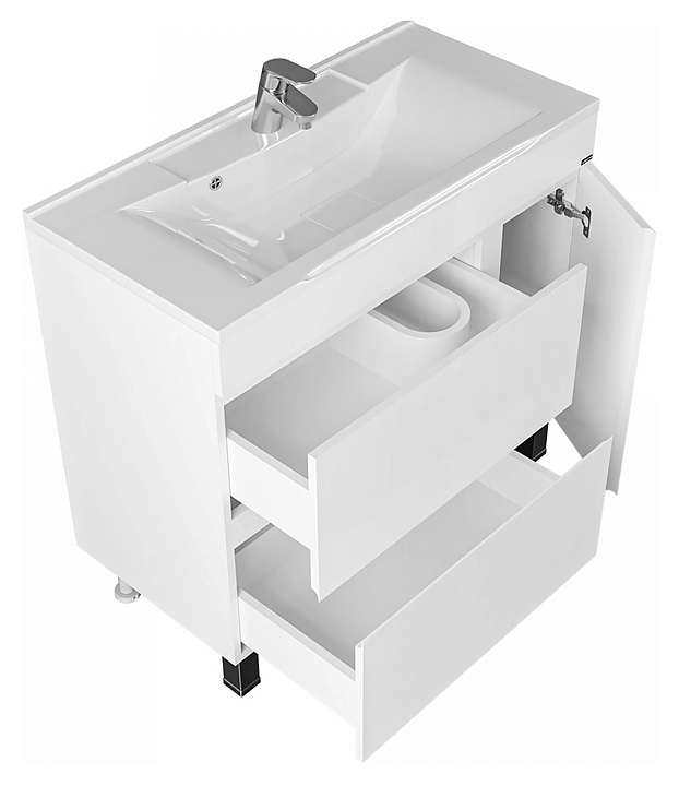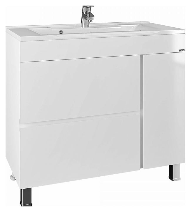 Тумба под раковину СаНта Марс 90 дополнит интерьер ванной комнаты. Модель оснащена 2 выдвижными ящиками, распашной дверцей и ножками, защищающими конструкцию от воздействия влаги в случае намокания пола. Корпус выполнен из влагостойкой ЛДСП, фасад - из МДФ и покрыт эмалью для защиты поверхности от внешних воздействий. Тумба используется вместе с раковиной Elen 90. Комплектация: