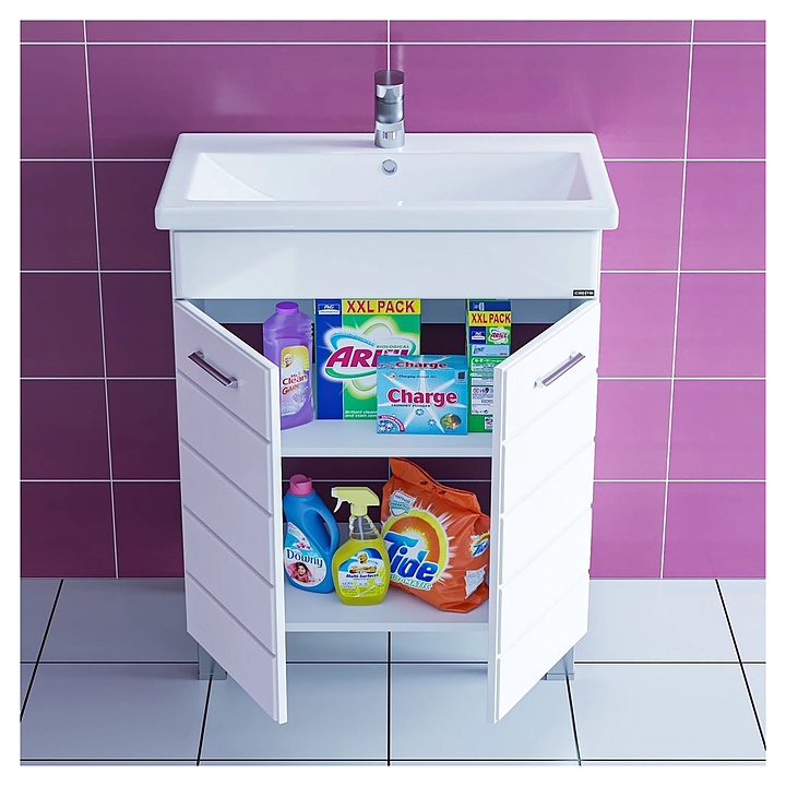 Тумба под раковину СаНта Омега 70 дополнит интерьер ванной комнаты. Модель оснащена 2 распашными дверцами и ножками, защищающими конструкцию от воздействия влаги в случае намокания пола. Корпус выполнен из влагостойкой ЛДСП, фасад - из МДФ и покрыт пленкой для защиты поверхности от внешних воздействий. Тумба используется вместе с раковиной Фостер 70. В комплект поставки входят 2 ручки, 2 хромированные и 2 пластиковые ножки. Особенности: