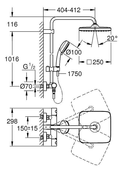 Душевая система с термостатом Grohe Tempesta Cosmopolitan System 250 Cube 26689000 предназначена для использования в ванных помещениях для подачи горячей и холодной воды. Модели коллекции Tempesta отличаются необычным дизайном и интересным сочетанием простых изгибов и обтекаемых форм. Известковый налет на душевых поверхностях с легкостью удаляется благодаря технологии SpeedClean, технология DreamSpray обеспечивает равномерную подачу воды через все форсунки душа, а технология EcoJoy ограничивает расход воды. Изделие выполнено из высококачественной латуни, отличающейся прочностью, долговечностью и устойчивостью к перепадам температур, а также имеет покрытие StarLight, устойчивое к царапинам и обеспечивающее блеск на много лет. Комплектация: