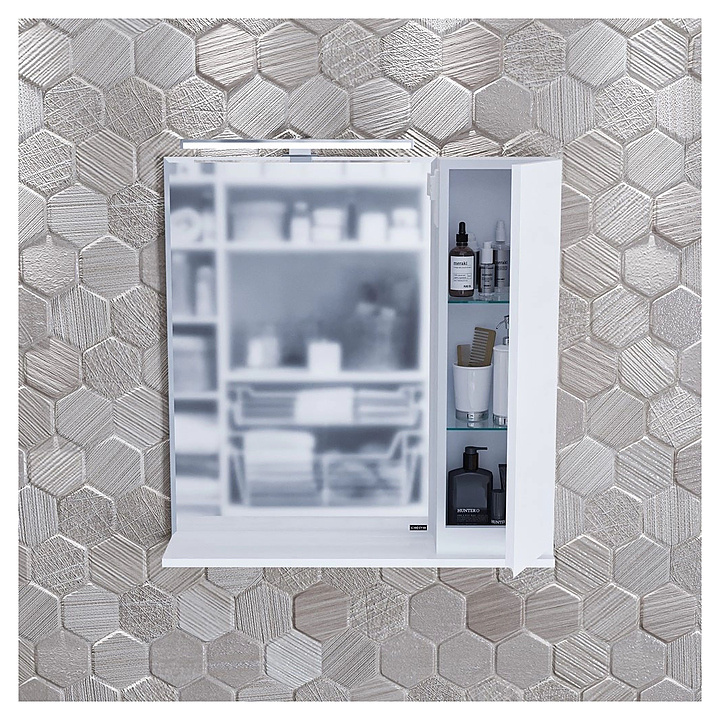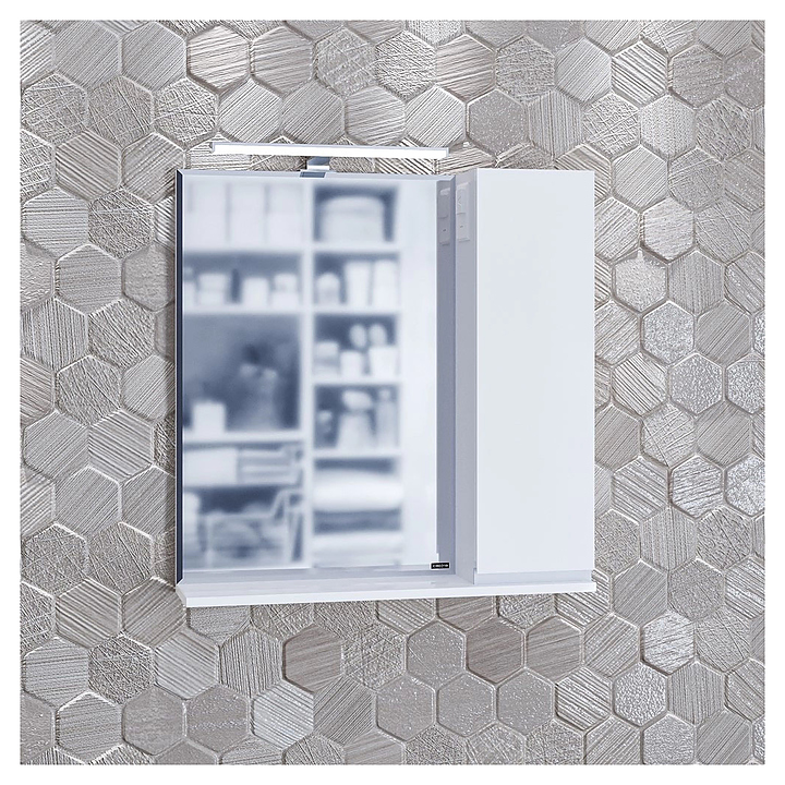 Зеркальный шкаф СаНта Марс 70 дополнит интерьер ванной комнаты. За счет подвесной конструкции изделие экономит пространство в ванной комнате и облегчает уборку. Модель оснащена распашной дверцей, 2 стеклянными полками за дверцей, открытой полкой в нижней части шкафа, светильником и розеткой. Особенности: