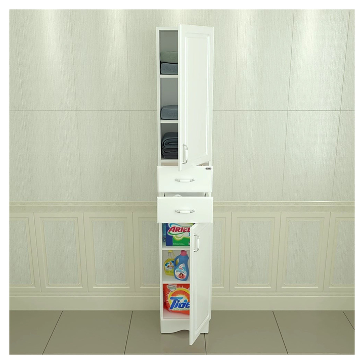 Шкаф-пенал СаНта Верона 30 дополнит интерьер ванной комнаты. Модель оборудована 2 распашными дверцами, 4 полками и 2 ящиками. Корпус выполнен из влагостойкой ЛДСП, фасад - из МДФ и покрыт ПВХ-пленкой для защиты от внешних воздействий. В комплект поставки входят 4 ручки. Особенности: