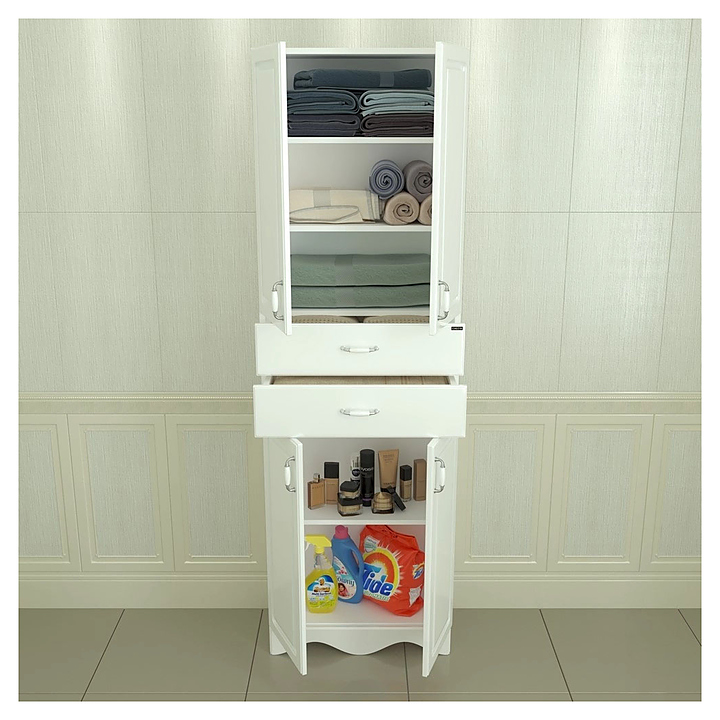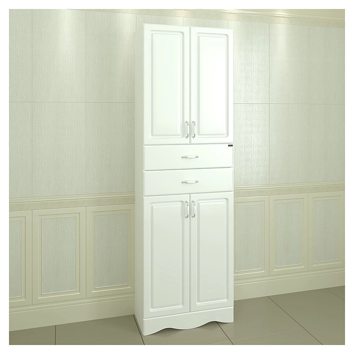 Шкаф-пенал СаНта Верона 60 дополнит интерьер ванной комнаты. Модель оборудована 4 распашными дверцами, 3 полками и 2 ящиками. Корпус выполнен из влагостойкой ЛДСП, фасад - из МДФ и покрыт ПВХ-пленкой для защиты от внешних воздействий. В комплект поставки входят 6 ручек. Особенности: