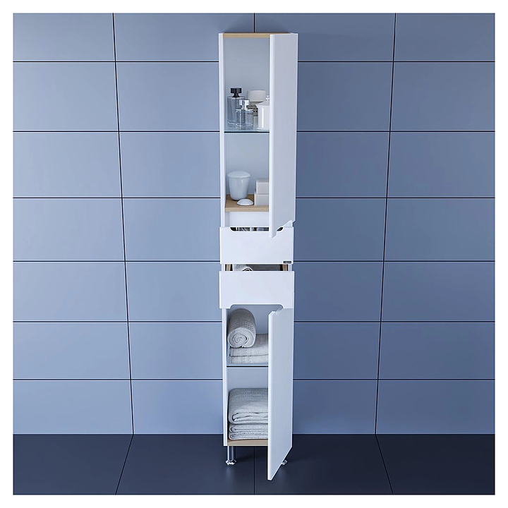 Шкаф-пенал СаНта Лондон 30 дополнит интерьер ванной комнаты. Модель оснащена 2 распашными дверцами, 2 стеклянными полками, 2 выдвижными ящиками и ножками, защищающими конструкцию от воздействия влаги в случае намокания пола. Корпус выполнен из влагостойкой ЛДСП, фасад - из МДФ и покрыт ПВХ-пленкой для защиты от внешних воздействий. В комплект поставки входят 2 хромированные и 2 пластиковые ножки. Особенности: