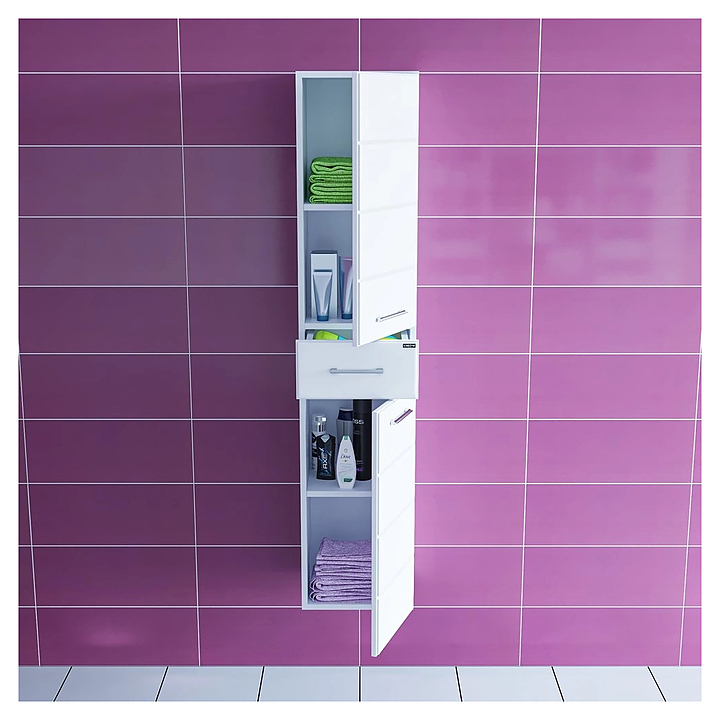 Шкаф-пенал СаНта Омега 30 дополнит интерьер ванной комнаты. За счет подвесной конструкции изделие не занимает много места, что позволяет экономить пространство, а также облегчает уборку. Модель оснащена 2 распашными дверцами, 2 полками и выдвижным ящиком. Корпус выполнен из влагостойкой ЛДСП, фасад - из МДФ и покрыт ПВХ-пленкой для защиты от внешних воздействий. В комплект поставки входят 3 ручки, 2 хромированные и 2 пластиковые ножки. Особенности: