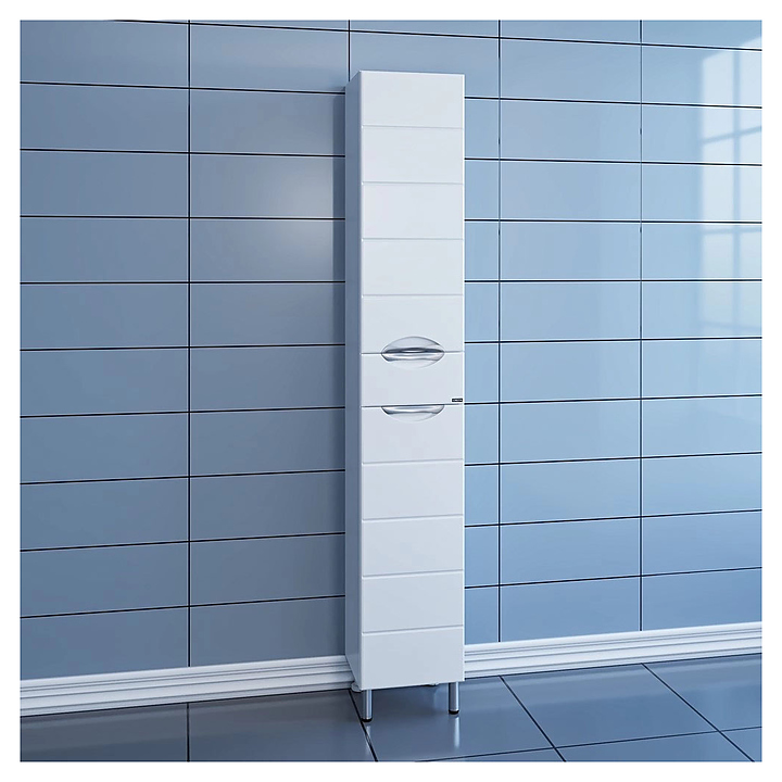Шкаф-пенал СаНта Родос 30 дополнит интерьер ванной комнаты. Модель оснащена 2 распашными дверцами, 4 полками, выдвижным ящиком и ножками, защищающими конструкцию от воздействия влаги в случае намокания пола. Изделие выполнено из МДФ и покрыто ПВХ-пленкой для защиты от внешних воздействий. В комплект поставки входят 3 ручки, 2 хромированные и 2 пластиковые ножки. Особенности: