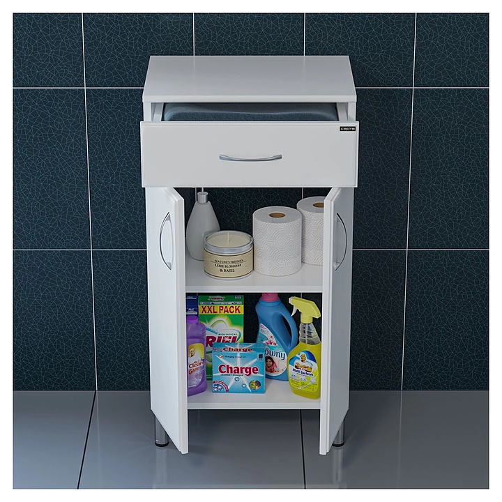 Напольная тумба СаНта Стандарт 45 дополнит интерьер ванной комнаты. Модель оснащена 2 распашными дверцами, выдвижным ящиком и ножками, защищающими конструкцию от воздействия влаги в случае намокания пола. Корпус выполнен из влагостойкой ЛДСП, фасад - из МДФ и покрыт ПВХ-пленкой для защиты поверхности от внешних воздействий. В комплект поставки входят вкладная полка, 3 ручки, 4 ножки. Особенности:
