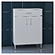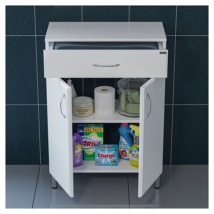 Напольная тумба СаНта Стандарт 60 дополнит интерьер ванной комнаты. Модель оснащена 2 распашными дверцами, закрепленной полкой, выдвижным ящиком и ножками, защищающими конструкцию от воздействия влаги в случае намокания пола. Корпус выполнен из влагостойкой ЛДСП, фасад - из МДФ и покрыт ПВХ-пленкой для защиты поверхности от внешних воздействий. В комплект поставки входят полка, 3 ручки, 4 ножки. Особенности: