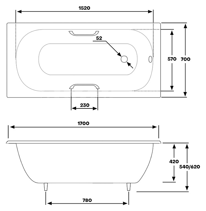 Ванна BYON B13 170x70x42 см с ручками, чугун