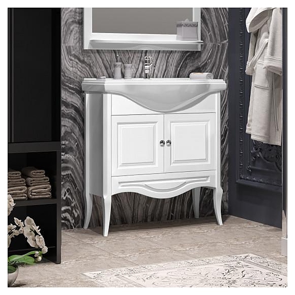 Тумба OPADIRIS Брунелла 80 00-00003631 выполнена в классическом стиле. Благодаря изящной отделке и классическим формам мебель станет украшением любой ванной комнаты. Модель оснащена 2 распашными фасад-дверцами, внутри которых находится полка и выдвижным ящиком в нижней части тумбы, где удобно хранить необходимые в ванной комнате личные принадлежности, аксессуары и элементы декора, раковина имеет слив-перелив и одно отверстие для смесителя, расположенное по центру. Корпус изделия выполнен из дерева. Тумба приобретается только в комплекте с раковиной KIROVIT Классик 800 003887. Раковина со смесителями в комплект поставки не входят и приобретаются отдельно. Тумба является частью гарнитура для ванной комнаты Брунелла 80 белый матовый. Внимание! На фото тумба с раковиной и смесителями, которые в комплект поставки не входят и приобретаются отдельно.