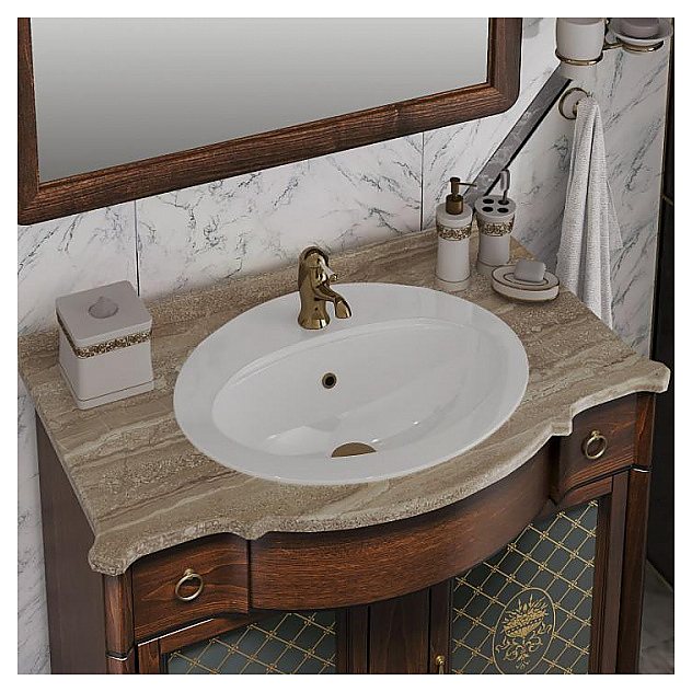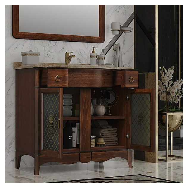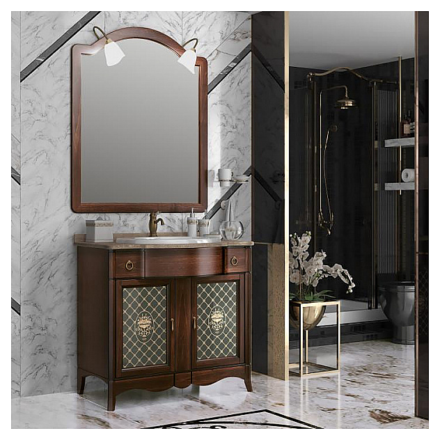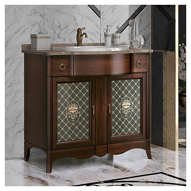 Гарнитур OPADIRIS Виктория 90 выполнен в классическом стиле. Тумба оснащена 2 распашными фасад-дверцами, внутри которых находятся полки и 2 небольшими выдвижными ящиками в верхней части изделия, раковина имеет слив-перелив и одно отверстие для смесителя, расположенное по центру. Благодаря изящной отделке и классическим формам мебель станет украшением любой ванной комнаты. Корпус изделия выполнен из массива бука, материал боковых сторон - ЛДСП, раковина - из керамики, столешница - из мрамора. Дополнить комплект можно пеналом Виктория светлый орех. Комплектация: