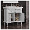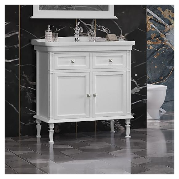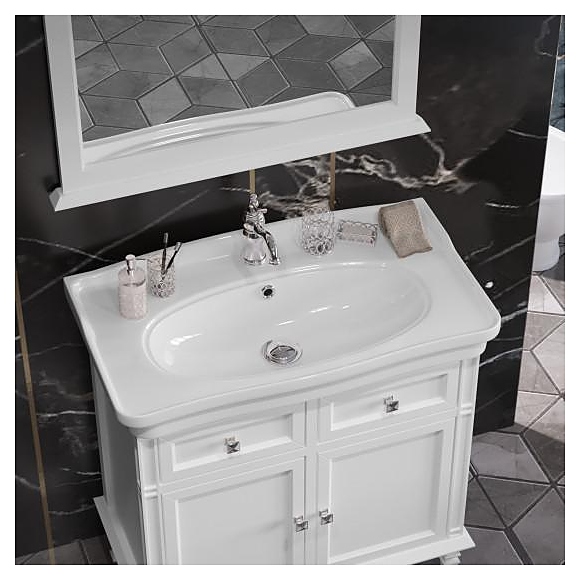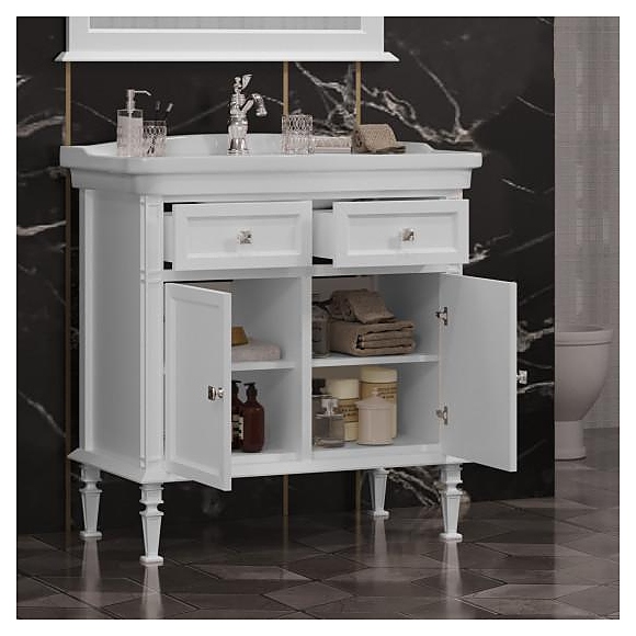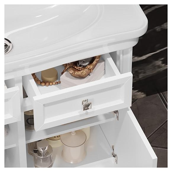 Гарнитур OPADIRIS Кантара 85 выполнен в классическом стиле. Тумба оснащена 2 ящиками и 2 распашными фасад-дверцами, раковина имеет слив-перелив и одно отверстие для смесителя, расположенное по центру. Напольная конструкция обеспечивает легкий монтаж и не требует специального ремонта в помещении. Благодаря изящной отделке и классическим формам мебель станет украшением любой ванной комнаты. Комплектация: