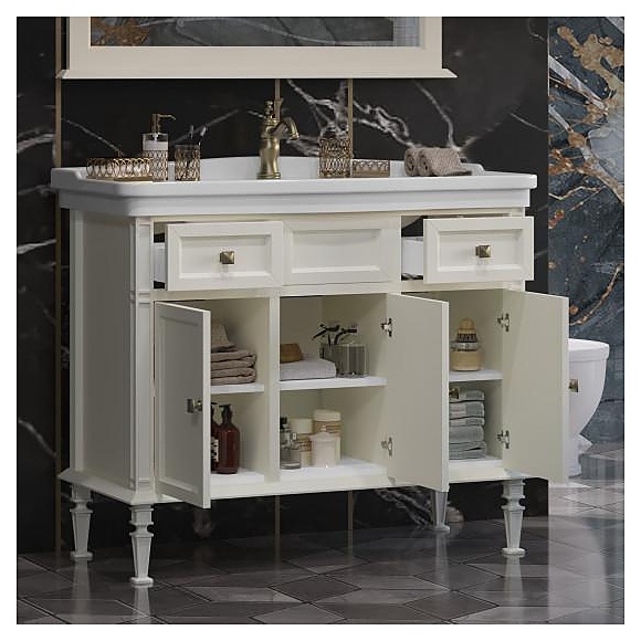 Тумба OPADIRIS Кантара 105 00-00003690 выполнена в классическом стиле. Модель оснащена 2 небольшими ящиками в верхней части изделия с механизмами плавного закрывания Hettich и 3 распашными фасад-дверцами. Напольная конструкция обеспечивает легкий монтаж и не требует специального ремонта в помещении. Благодаря изящной отделке и классическим формам мебель станет украшением любой ванной комнаты. Тумба приобретается только в комплекте с раковиной Kirovit Модерн 105 4640021063583. Раковина со смесителем в комплект поставки не входят и приобретаются отдельно. Тумба является частью гарнитура для ванной комнаты Кантара 105, слоновая кость. Дополнительные характеристики:
