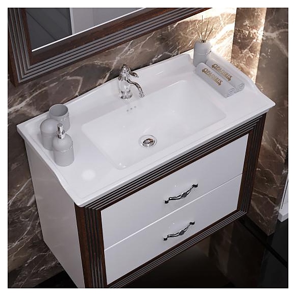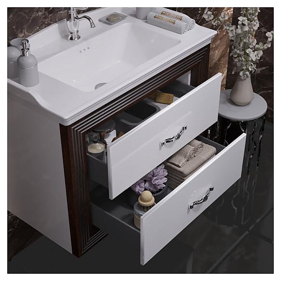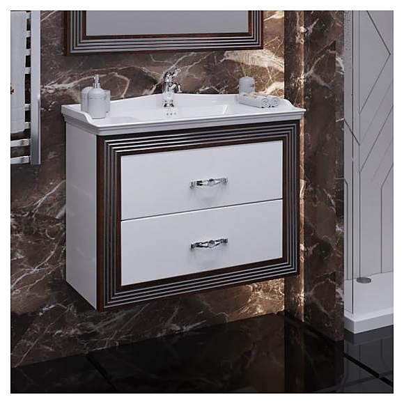 Гарнитур OPADIRIS Карат 80 выполнен в современном стиле. Тумба оснащена 2 ящиками с механизмом плавного закрытия, зеркало - LED-подсветкой, раковина имеет слив-перелив и одно отверстие для смесителя, расположенное по центру. Благодаря подвесной конструкции изделие не занимает много места и обеспечивает легкую уборку в ванной комнате. Фасады мебели для ванной комнаты коллекции Карат изготавливаются из высококачественного МДФ с глянцевым покрытием - белый оттенок для обрамления с серебрянной патиной, обрамления для ящиков и зеркала выполнены из натурального массива бука в сочетании с серебрянной патиной. Комплектация: