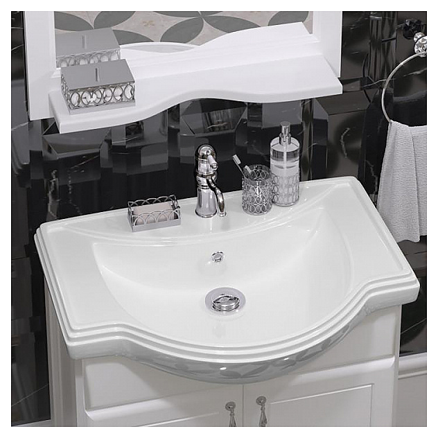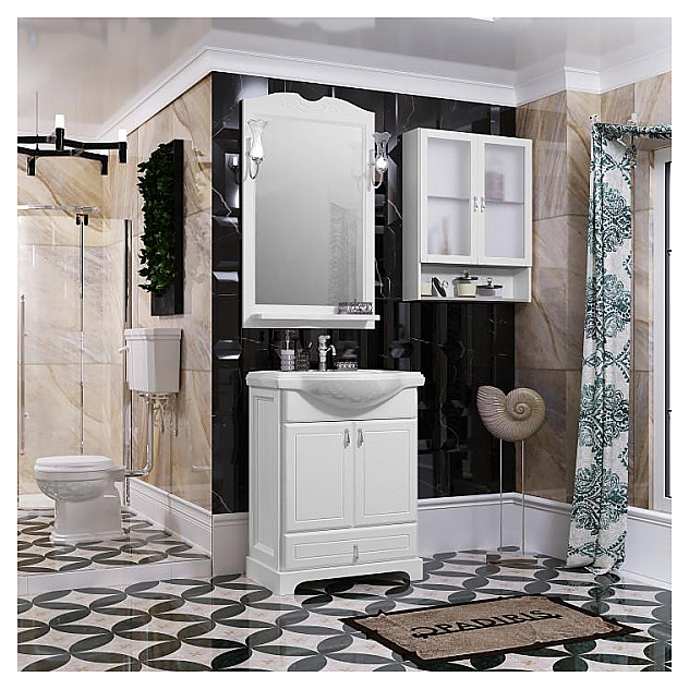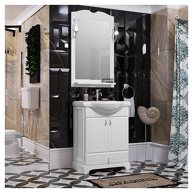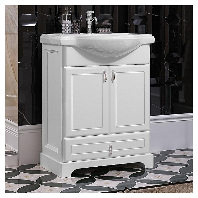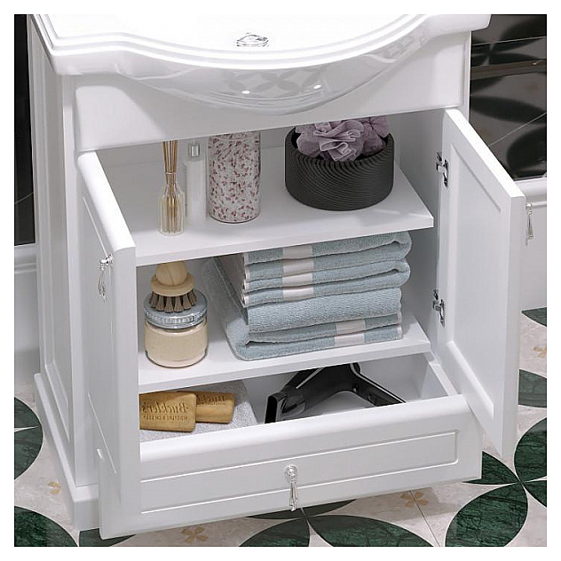 Гарнитур OPADIRIS Клио 65 выполнен в классическом стиле. Тумба оснащена выдвижным ящиком с механизмом плавного закрывания Hettich и 2 распашными фасад-дверцами, раковина имеет слив-перелив и одно отверстие для смесителя, расположенное по центру. Напольная конструкция обеспечивает легкий монтаж и не требует специального ремонта в помещении. Благодаря изящной отделке и классическим формам мебель станет украшением любой ванной комнаты. Корпус изделия выполнен из массива бука, боковины - из ЛДСП. Комплектация: