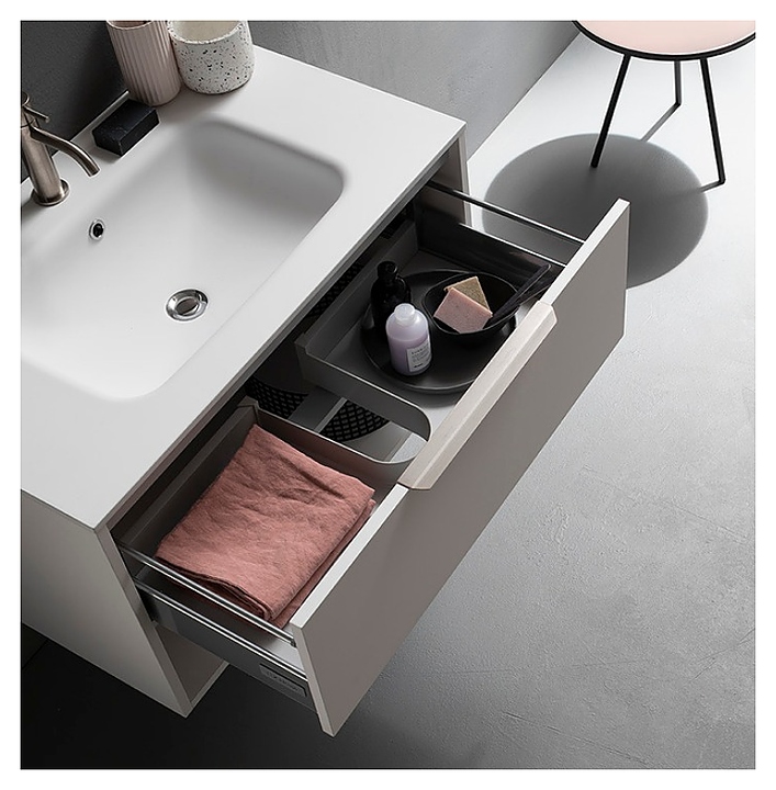 Гарнитур Cerasa Assolo дополнит интерьер любой ванной комнаты. В комплект входят тумба под раковину, раковина и зеркало. Тумба оснащена выдвижным ящиком с ручкой и открытой полкой, зеркало - LED подсветкой. Раковина имеет одно отверстие для смесителя, расположенное по центру. Дополнительные характеристики: