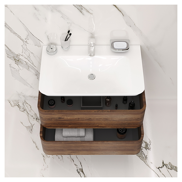Гарнитур AM.PM Sensation 20929 дополнит интерьер ванной комнаты. В комплект входят тумба под раковину, раковина и зеркальный шкаф. Тумба оснащена 2 ящиками с механизмом полного выдвижения, зеркальный шкаф - LED подсветкой. Раковина имеет отверстие для смесителя, расположенное по центру. Изделие выполнено из МДФ и покрыто текстурированным шпоном, раковина - из искусственного мрамора. Особенности: