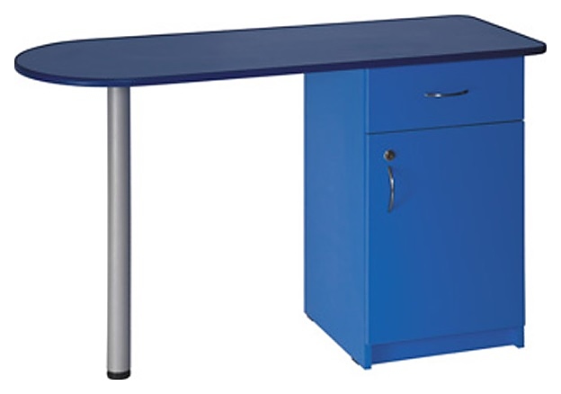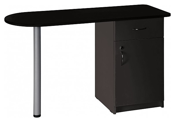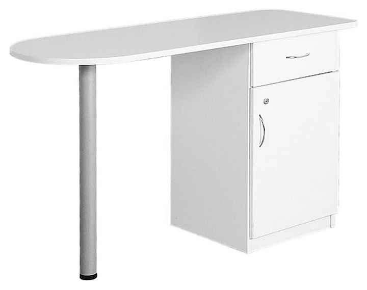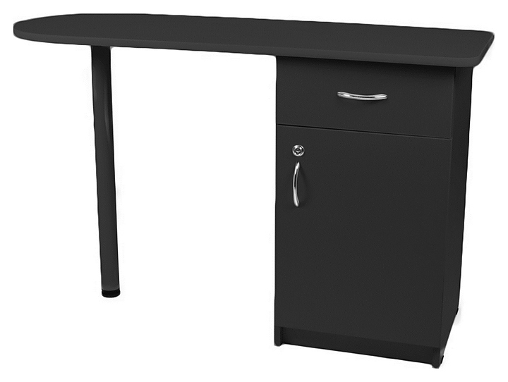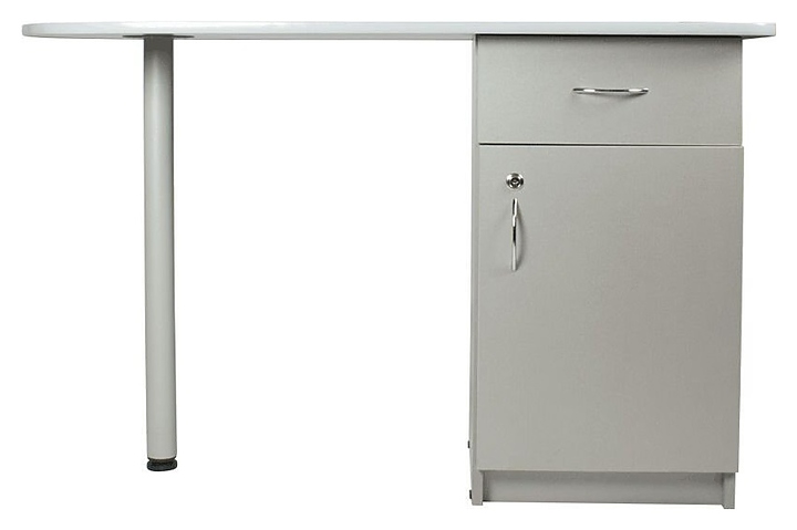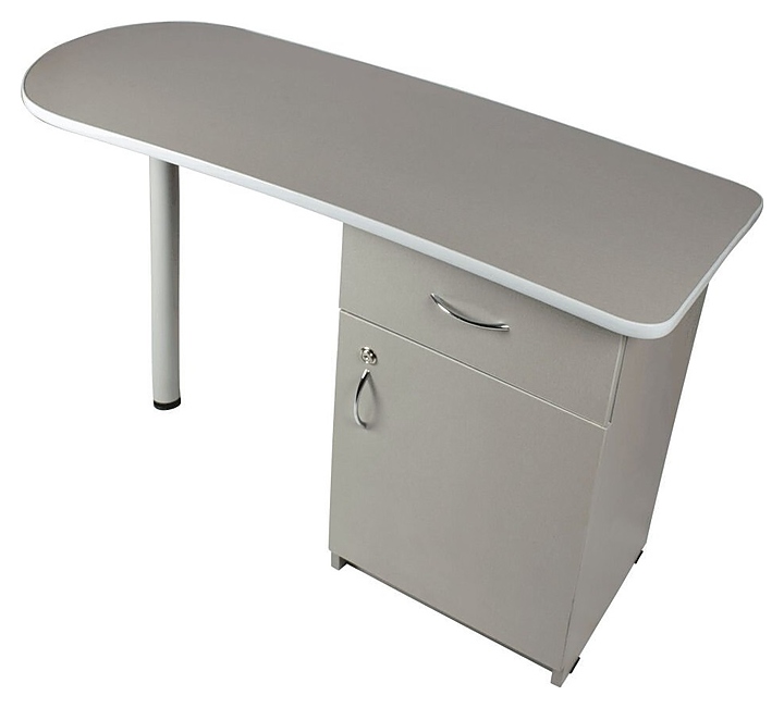 Маникюрный стол Имидж Мастер БРИДЖ предназначен для обустройства рабочего пространства мастера маникюра в косметологических центрах, салонах красоты и домашних студиях ногтевого сервиса. Модель оснащена широкой столешницей с полугруглым левым краем, цилиндрической опорой на подпятнике, встроенной тумбой с выдвижным ящиком и запираемым на ключ отделением с распашной дверцей для хранения оборудования, аксессуаров и расходных материалов. Столешница и тумба изготовлены из высококачественной ламинированной древесно-стружечной плиты с облицовкой влагостойкой пленкой, опора – из металла. Особенности: