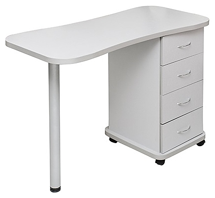 Маникюрный стол Имидж Мастер ЭСТИ 1 предназначен для обустройства рабочего пространства мастера маникюра в косметологических центрах, салонах красоты и домашних студиях ногтевого сервиса. Модель оснащена столешницей, цилиндрической опорой на подпятнике, встроенной тумбой на колесах с 4 выдвижными ящиками для хранения оборудования, аксессуаров и расходных материалов. Столешница и тумба изготовлены из высококачественной ламинированной древесно-стружечной плиты с облицовкой влагостойкой пленкой, опора – из металла, колеса – из прочного пластика. Особенности: