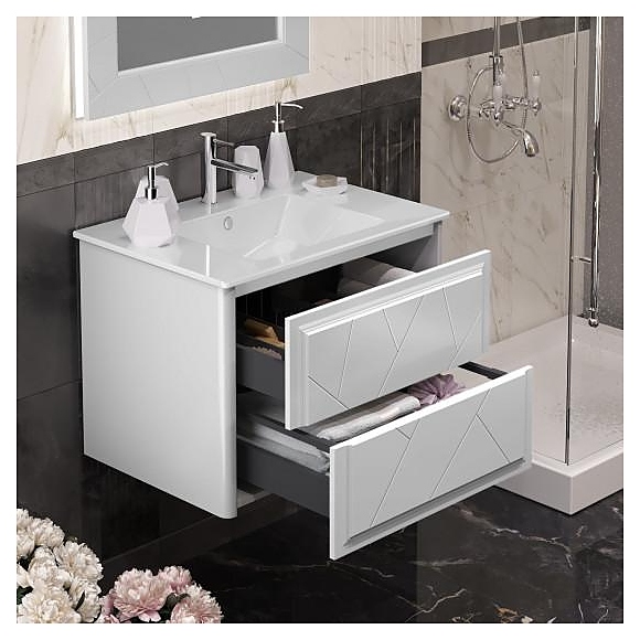 Гарнитур OPADIRIS Луиджи 70 выполнен в современном стиле. Тумба оснащена 2 ящиками с механизмом плавного закрытия, зеркало - LED-подсветкой, раковина имеет слив-перелив и одно отверстие для смесителя, расположенное по центру. Благодаря подвесной конструкции изделие не занимает много места и обеспечивает легкую уборку в ванной комнате. Комплектация:
