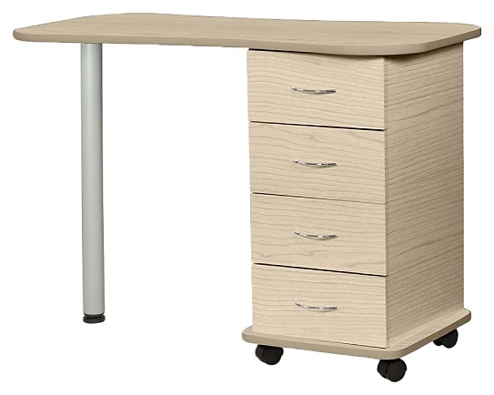 Маникюрный стол Имидж Мастер ЭСТИ 1 предназначен для обустройства рабочего пространства мастера маникюра в косметологических центрах, салонах красоты и домашних студиях ногтевого сервиса. Модель оснащена столешницей, цилиндрической опорой на подпятнике, встроенной тумбой на колесах с 4 выдвижными ящиками для хранения оборудования, аксессуаров и расходных материалов. Столешница и тумба изготовлены из высококачественной ламинированной древесно-стружечной плиты с облицовкой влагостойкой пленкой, опора – из металла, колеса – из прочного пластика. Особенности:
