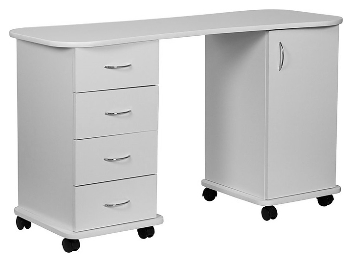 Маникюрный стол Имидж Мастер ЭСТИ 2 предназначен для обустройства рабочего пространства мастера маникюра в косметологических центрах, салонах красоты и домашних студиях ногтевого сервиса. Модель оснащена столешницей и 2 встроенными тумбами на колесах. Одна из тумб укомплектована 4 выдвижными ящиками, другая – отделением с распашной дверцей для хранения оборудования, аксессуаров и расходных материалов. Столешница и тумбы изготовлены из высококачественной ламинированной древесно-стружечной плиты с облицовкой влагостойкой пленкой, опора – из металла, колеса – из прочного пластика. Особенности: