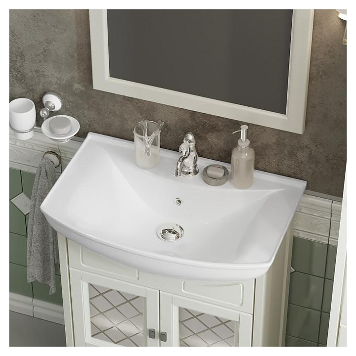 Тумба напольная под раковину OPADIRIS Омега 65 00-00003138 выполнена в классическом стиле. Модель оснащена 2 распашными фасад-дверцами, внутри которых находится полка и выдвижным ящиком в нижней части тумбы, где удобно хранить необходимые в ванной комнате личные принадлежности, аксессуары и элементы декора, раковина имеет слив-перелив и одно отверстие для смесителя, расположенное по центру. Напольная конструкция обеспечивает легкий монтаж и не требует специального ремонта в помещении. Благодаря изящной отделке и классическим формам мебель станет украшением любой ванной комнаты. Корпус изделия выполнен из массива бука и филенки МДФ, материал боковых сторон - массив бука с ЛДСП. Тумба приобретается только в комплекте с раковиной KIROVIT Стиль 650 004060. Раковина со смесителем в комплект поставки не входят и приобретаются отдельно. Тумба является частью гарнитура для ванной комнаты Омега 65, слоновая кость. Дополнительные характеристики: