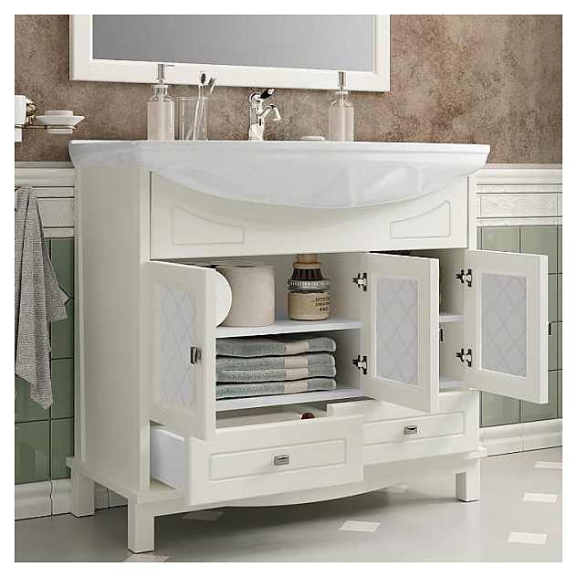 Тумба напольная под раковину OPADIRIS Омега 85 00-00002824 выполнена в классическом стиле. Модель оснащена 3 распашными фасад-дверцами, внутри которых находится полка и 2 выдвижными ящиками в нижней части тумбы, где удобно хранить необходимые в ванной комнате личные принадлежности, аксессуары и элементы декора. Напольная конструкция обеспечивает легкий монтаж и не требует специального ремонта в помещении. Благодаря изящной отделке и классическим формам мебель станет украшением любой ванной комнаты. Корпус изделия выполнен из массива бука и филенки МДФ, материал боковых сторон - массив бука с ЛДСП. Тумба приобретается только в комплекте с раковиной KIROVIT Стиль 850 4620008197357. Раковина со смесителем в комплект поставки не входят и приобретаются отдельно. Тумба является частью гарнитура для ванной комнаты Омега 85, слоновая кость. Дополнительные характеристики: