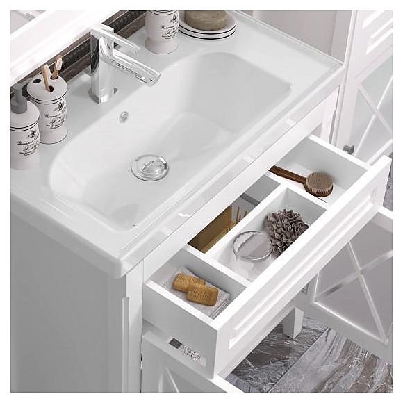 Тумба напольная под раковину OPADIRIS Палермо 80 00-00002353 выполнена в классическом стиле. Модель оснащена распашными фасад-дверцами и небольшим ящиком в верхней части изделия. Напольная конструкция обеспечивает легкий монтаж и не требует специального ремонта в помещении. Благодаря изящной отделке и классическим формам мебель станет украшением любой ванной комнаты. Корпус изделия выполнен из массива бука, материал боковых сторон - массив буква и ДСП со шпоном, раковина - из литьевого мрамора. Тумба приобретается только в комплекте с раковиной Cerastyle Frame 80 031200-u. Раковина со смесителем в комплект поставки не входят и приобретаются отдельно. Тумба является частью гарнитура для ванной комнаты Палермо 80, белый матовый. Внимание! На фото тумба с раковиной и смесителем, которые в комплект поставки не входят и приобретаются отдельно.