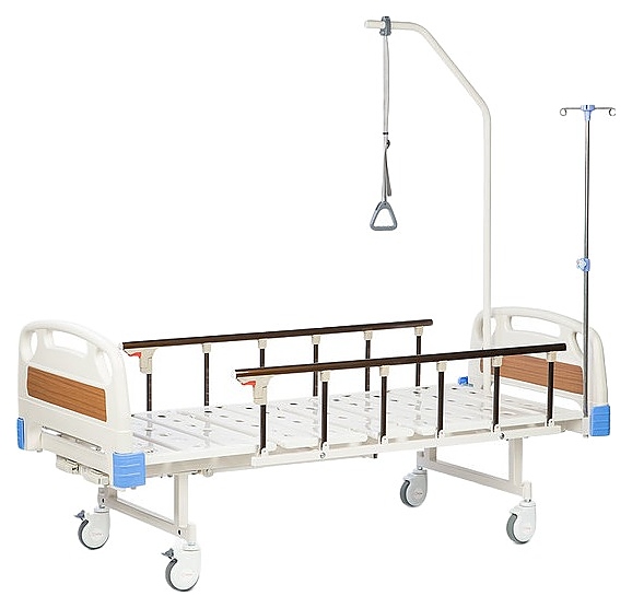Механическая медицинская кровать Армед SAE-105-B используется в госпиталях, диагностических и реабилитационных центрах, клиниках, санаториях и других медицинских и лечебно-профилактических учреждениях, а также в домашних условиях для комфортного размещения пациента. Модель оснащена анатомическим ложементом с 4 секциями, 2 механическими приводами, 2 складными боковыми ограждениями, 2 съемными торцевыми спинками и устойчивыми опорами на колесах. Каркас и секции ложемента изготовлены из стального профиля с антикоррозийным покрытием эпоксидной эмалью, боковые ограждения – из металла, спинки – из АБС-пластика с декоративными вставками под дерево. В комплект поставки входят инфузионная стойка, штанга для подтягивания и набор крепежа. Особенности: