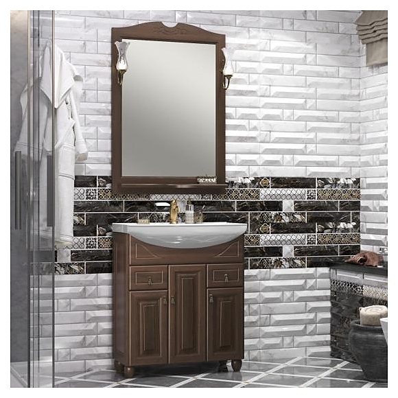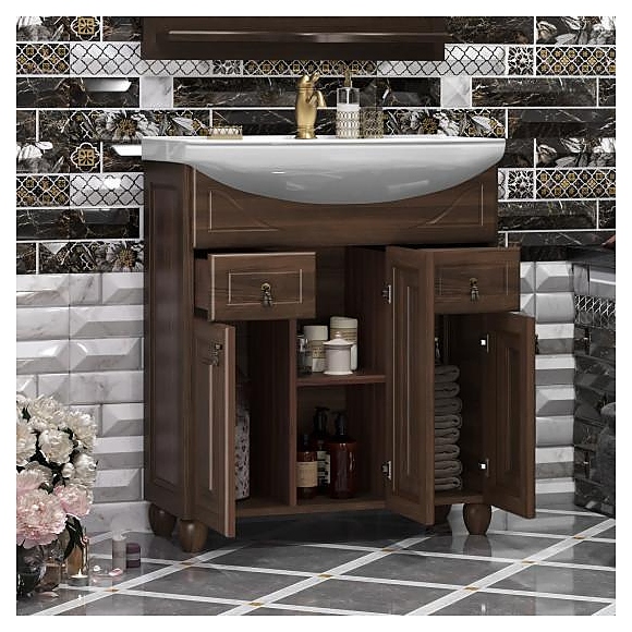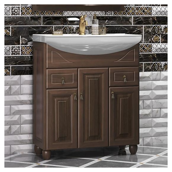Гарнитур OPADIRIS Тибет 75 выполнен в классическом стиле. Тумба оснащена 3 распашными фасад-дверцами и 2 выдвижными ящиками, раковина имеет слив-перелив и одно отверстие для смесителя, расположенное по центру. Напольная конструкция обеспечивает легкий монтаж и не требует специального ремонта в помещении. Благодаря изящной отделке и классическим формам мебель станет украшением любой ванной комнаты. Корпус изделия выполнен из массива бука и МДФ, материал боковых сторон - массив бука и МДФ со шпоном. Комплектация: