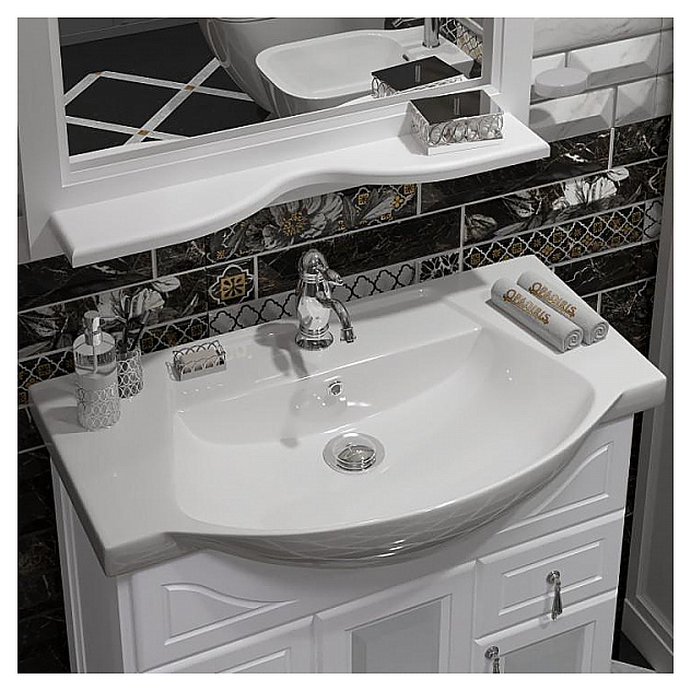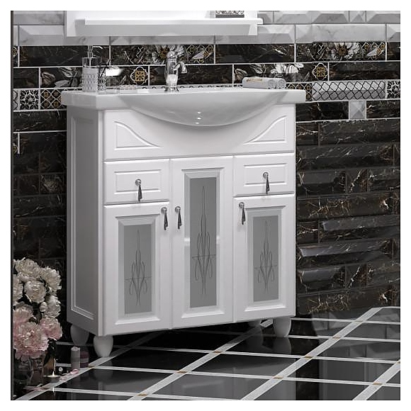 Гарнитур OPADIRIS Тибет 75 выполнен в классическом стиле. Тумба оснащена 3 распашными фасад-дверцами и 2 выдвижными ящиками, раковина имеет слив-перелив и одно отверстие для смесителя, расположенное по центру. Напольная конструкция обеспечивает легкий монтаж и не требует специального ремонта в помещении. Благодаря изящной отделке и классическим формам мебель станет украшением любой ванной комнаты. Корпус изделия выполнен из массива бука и МДФ, материал боковых сторон - массив бука и МДФ со шпоном. Комплектация:
