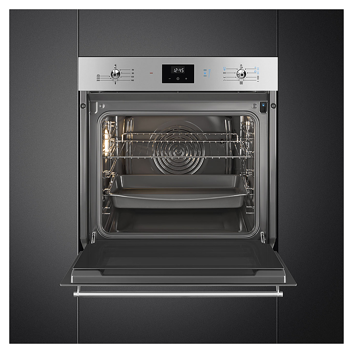 Духовой шкаф SMEG SO6300S2X серии Classica предназначен для приготовления пищи в домашних условиях. Модель оснащена LED-дисплеем с сенсорным управлением и поворотными переключателями. Корпус выполнен из матовой нержавеющей стали с обработкой против отпечатков пальцев, дверца - из стекла Eclipse с 2 горизонтальными полосами, ручки - из нержавеющей стали. В комплект поставки входят решетка с ограничителем, глубокий эмалированный противень (50 мм) и комплект для залива воды. Особенности: