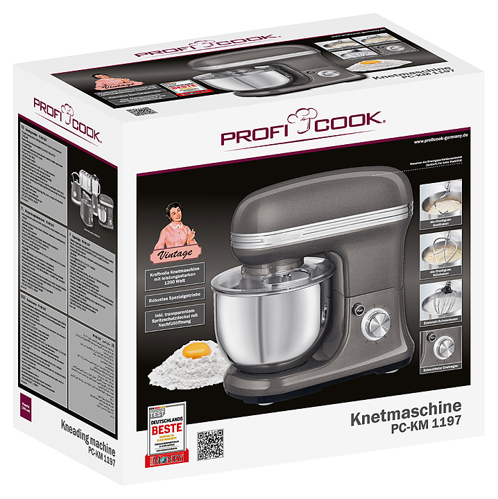 Кухонный комбайн Profi Cook PC-KM 1197 предназначен для замеса теста, смешивания и взбивания различных продуктов в квартирах, частных домах, кафе и ресторанах. Модель оснащена электронной регулировкой скорости и высокопроизводительным мотором с длительным сроком службы. Корпус выполнен из окрашенного алюминия, чаша и венчик - из нержавеющей стали, крюк и насадка для легкого теста - из алюминия. Особенности: