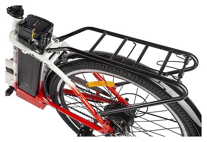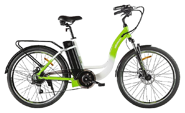 Велогибрид Eltreco White используется для комфортного передвижения по городу, а также для доставки заказов клиентам. Модель оснащена дисковыми тормозами, задним багажником и изогнутой рамой. Рама выполнена из алюминия, седло - из эко-кожи. Особенности: