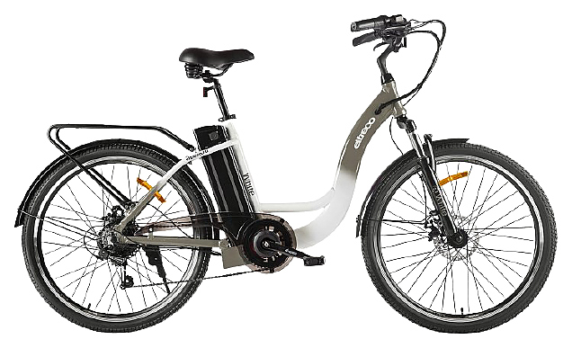 Велогибрид Eltreco White используется для комфортного передвижения по городу, а также для доставки заказов клиентам. Модель оснащена дисковыми тормозами, задним багажником и изогнутой рамой. Рама выполнена из алюминия, седло - из эко-кожи. Особенности: