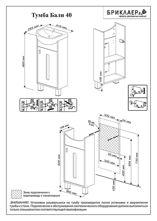 Тумба под раковину БРИКЛАЕР Бали 40 см напольная, правая, светлая лиственница/белый глянец