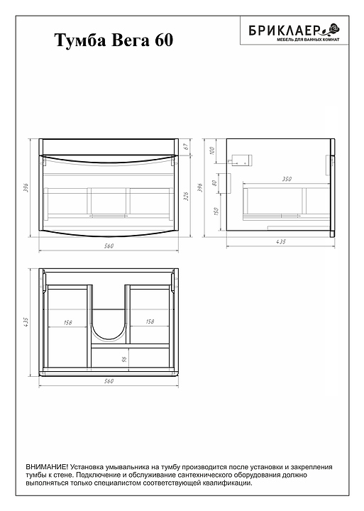 Тумба под раковину БРИКЛАЕР Вега 60 см подвесная, белый глянец