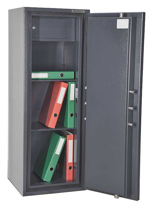 Сейф взломостойкий огнестойкий Меткон СМ2-120Э предназначен для хранения бумажных документов, ценных вещей в гостиницах, отелях, офисах, квартирах и загородных домах. Модель оснащена ригелями с защитой от высверливания и выбивания, двумя съемными полками и трейзером, поворотной ручкой и кодовым электронным замком SecuRam класса В. В комплект поставки входит анкерный болт. Особенности: