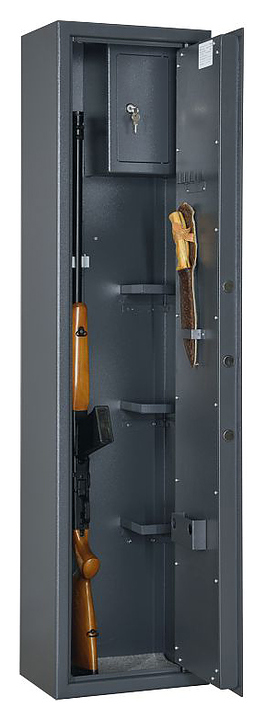 Сейф оружейный Меткон СО-2А предназначен для хранения оружия, патронов и принадлежностей. Модель оснащена съемными полками, роликовыми ложементами, трейзером под патроны, отверстиями для крепления на задней стенке. В двери установлены 2 ключевых 8-ми сувальдных замка с ригельной системой запирания в 3 стороны и замок «Бордер». Дополнительные характеристики:
