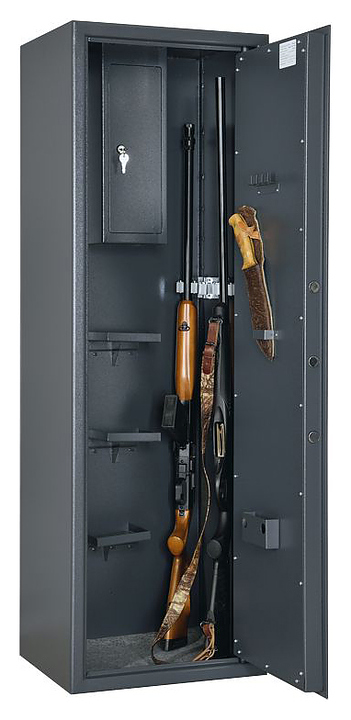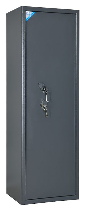 Сейф оружейный Меткон СО-6А предназначен для хранения оружия, патронов и принадлежностей. Модель оснащена съемными полками, роликовыми ложементами, трейзером под патроны, отверстиями для крепления на задней стенке. В двери установлены 2 ключевых сувальдных замка с ригельной системой запирания и замок «Бордер». Дополнительные характеристики: