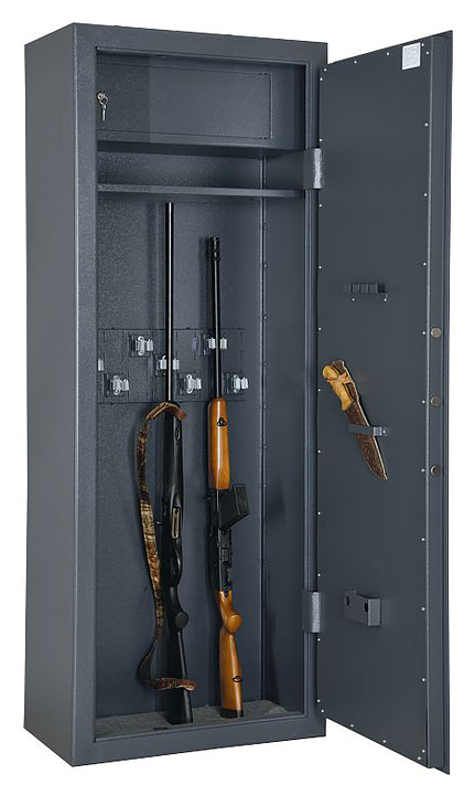Сейф оружейный Меткон СО-8А предназначен для хранения оружия, патронов и принадлежностей. Модель оснащена отверстиями для крепления на задней стенке и днище корпуса, 2 ключевыми 8-ми сувальдными замками с ригельной системой запирания в 3 стороны, роликовыми ложементами и трейзером. Дополнительные характеристики: