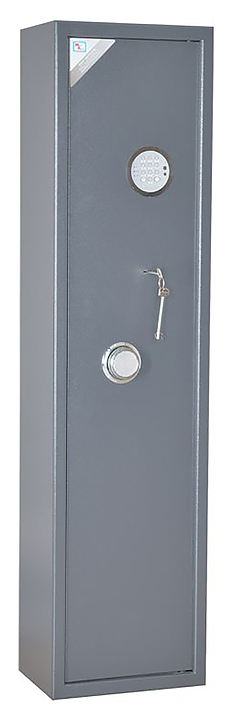 Сейф оружейный Меткон СО-2ЭК предназначен для хранения оружия, патронов и принадлежностей. Модель оснащена съемными полками, роликовыми ложементами, трейзером под патроны, отверстиями для крепления на задней стенке. В двери установлен электронный замок с ригельной системой запирания. Дополнительные характеристики: