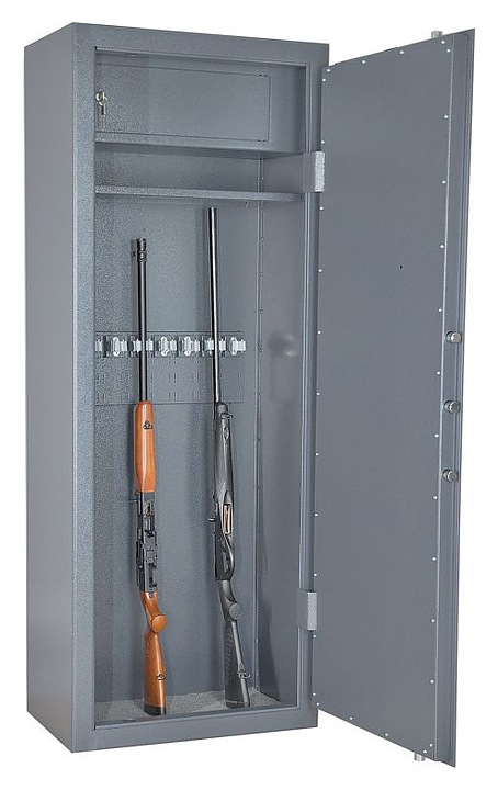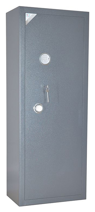 Сейф оружейный Меткон СО-8ЭК предназначен для хранения оружия, патронов и принадлежностей. Модель оснащена съемной полкой, роликовыми ложементами, трейзером под патроны, отверстиями для крепления на задней стенке. В двери установлен электронный замок с ригельной системой запирания. Дополнительные характеристики: