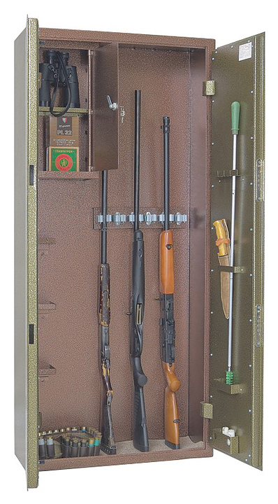 Сейф Меткон ОШ-6П предназначен для хранения оружия, патронов и принадлежностей. Модель оснащена 3 съемными полками, отверстиями для крепления на задней стенке корпуса, 2 ключевыми замками и трейзером. Внутренняя поверхность сейфа выполнена из коврика, ложементы - из металла с резиновыми роликами. Дополнительные характеристики:
