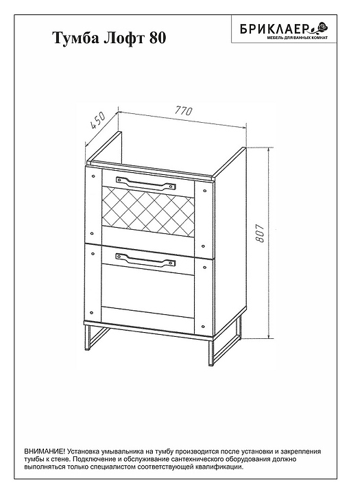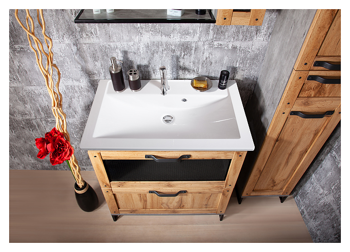 Тумба БРИКЛАЕР Лофт 80 выполнена в эко-стиле и станет украшением любой ванной комнаты. Модель оснащена 2 выдвижными ящиками с шариковыми направляющими для хранения ванных принадлежностей. Корпус мебели выполнен из влагостойкой ламинированной ДСП, обладающей устойчивыми свойствами к восприятию агрессивной влажной среды ванной комнаты, фасад - из МДФ, фурнитура - из матового черного металла. Может использоваться в комплекте с раковиной Фостер 80, Como 80 или Mario 80. Особенности: